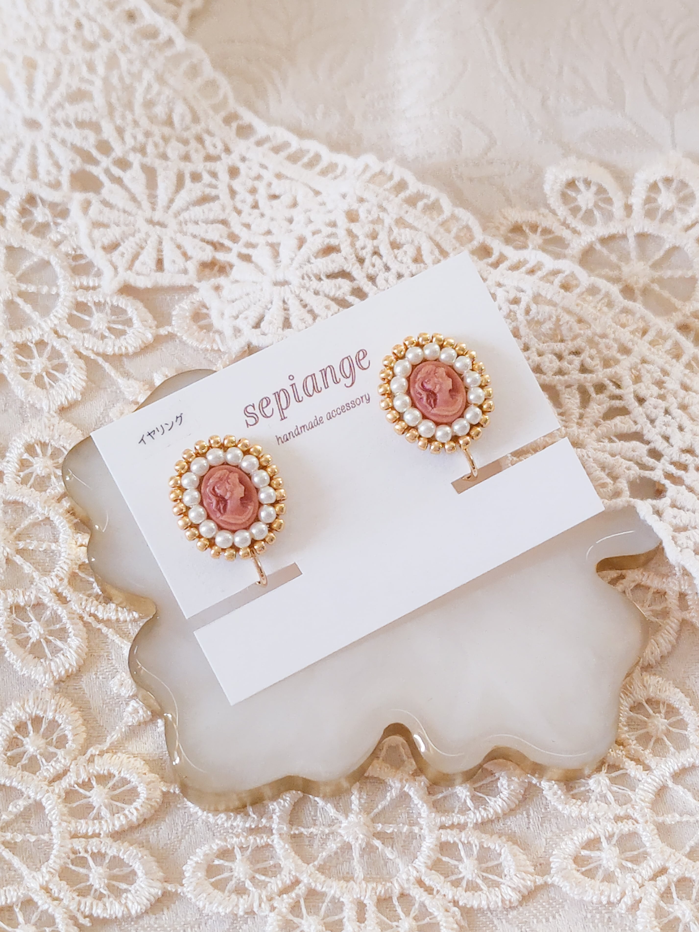 ビーズ刺しゅうの技法で小さめの貴婦人のカメオの周りにパールやビーズを1つひとつ縫いつけて製作しました。 お洋服に合わせて、おしゃれを楽しむ1つのアイテムとしてコーディネイトして楽しんでください♪ ──────────────────── 中心は小さめの貴婦人のカメオです。 カメオといえば貴婦人を思い浮かべることが多いかと思います。 小さいですが、そのイメージの貴婦人が繊細に彫られたカメオを使っております。 お色はローズ色。 少し朱色がかった、落ち着いた色味です。 ──────────────────── 縁周りはビーズで丁寧にステッチしています。 カメオのお色にあわせてビーズやパールの色も変え クラシカルな雰囲気になるよう たくさんの色の中から選んで製作しました。 ──────────────────── 裏側はゴールドのフェイクレザーを使用し 金具があまり見えないような工夫をしております。 フェイクレザーのゴールドのお色は表側に合わせて選んでいますので、それぞれ違います。 (ベージュに近いお色や黄色みが強いもの、カーキに近いものなど) そして、耳に触れる部分にフェイクレザーを使うことで肌触りもよく 痛くなりにくいとご好評いただいております。 ──────────────────── サイズ:縦2cmx横1.8cm 金具:ネジバネイヤリング、チタンピアス 金具の色:ゴールド 素材:ビーズ、パール、カメオカボション、金具(真鍮、チタン) ※ピアス・イヤリングはオプションからお選びください。 ──────────────────── 色展開:6色 ○ローズ https://sepiange.base.shop/items/43792887 ○ダークローズ https://sepiange.base.shop/items/55854264 ○ライトブラウン https://sepiange.base.shop/items/55854319 ○ダークブラウン https://sepiange.base.shop/items/55854345 ○オリーブグリーン https://sepiange.base.shop/items/55854405 ○ブルーグレー https://sepiange.base.shop/items/55854405 ──────────────────── アクセサリーはすべて小箱にお入れしての発送となります。 ご不明な点、ご質問はご注文の前にお願い致します。