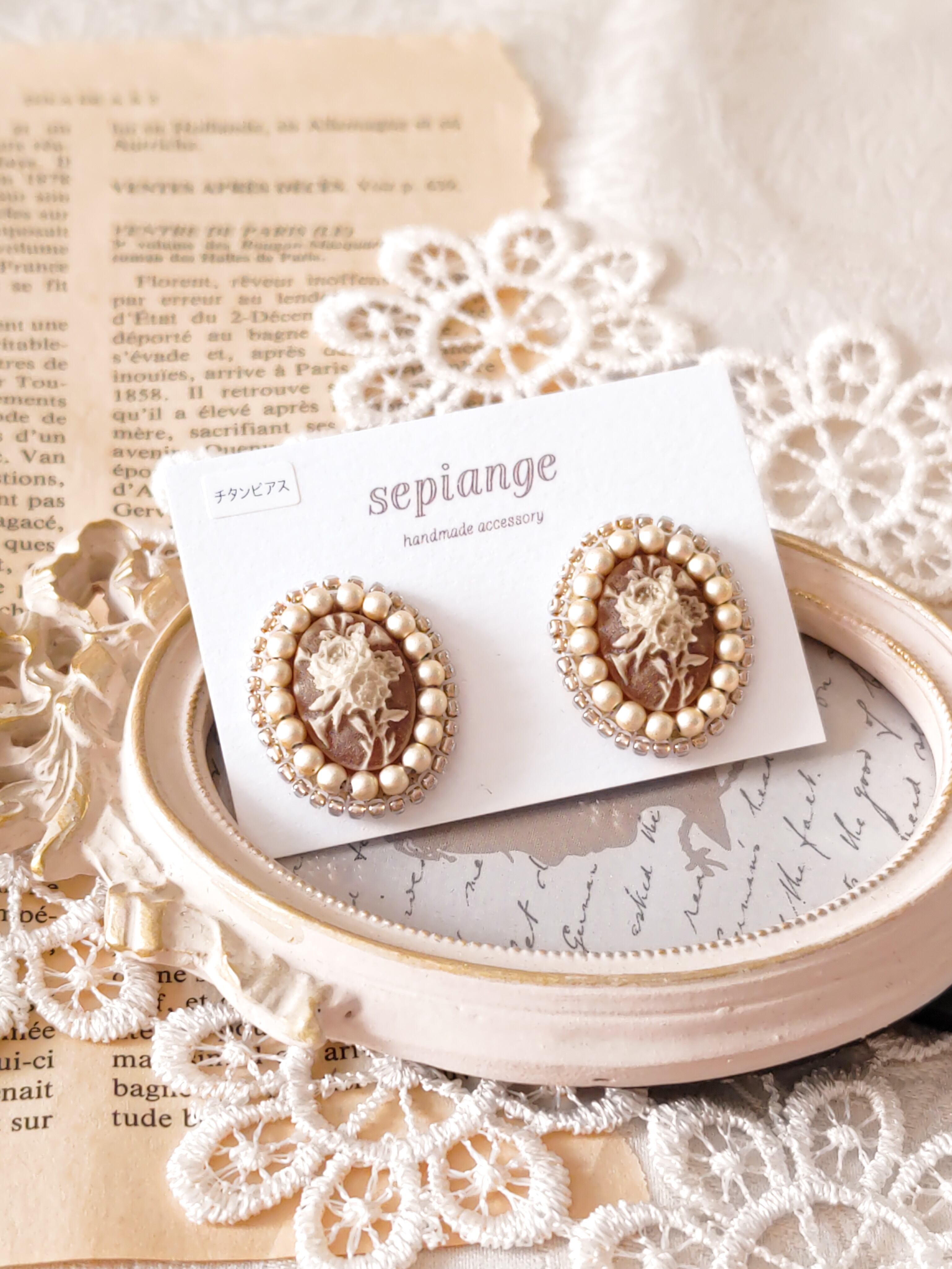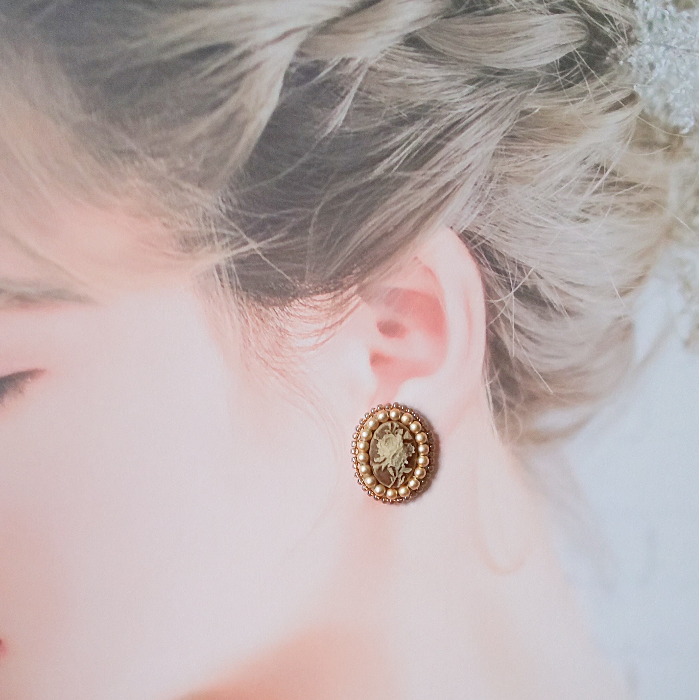 ビーズ刺しゅうの技法でお花のカメオの周りにパールやビーズを1つひとつ縫いつけて製作しました。 白や薄めのお色のお洋服だとイヤリングが映えると思います。 今日はこのお洋服の色だからこのイヤリングにしよう♪など お出かけの時にお洋服などと合わせて おしゃれを楽しむアイテムとしてコーディネイトして楽しんでください。 ──────────────────── 中心はお花のカメオです。 カメオといえば貴婦人を思い浮かべることが多いかと思います。 こちらはお花が繊細に彫られたカメオを使っております。 お色はローズ色。 少し朱色がかった、落ち着いた色味です。 ──────────────────── 縁周りはビーズで丁寧にステッチしています。 カメオのお色にあわせてビーズやパールの色も変え クラシカルな雰囲気になるよう たくさんの色の中から選んで製作しました。 ──────────────────── 裏側はゴールドのフェイクレザーを使用し 金具があまり見えないような工夫をしております。 そして、耳に触れる部分にフェイクレザーを使うことで肌触りもよく 痛くなりにくいとご好評いただいております。 イヤリングはシリコンゴム付きです。 ──────────────────── サイズ:縦2.6cmx横2.2cm 金具:蝶バネイヤリング、チタンピアス 金具の色:ゴールド 素材:ビーズ、パール、カメオカボション、金具(真鍮、チタン) ※ピアス・イヤリングはオプションからお選びください。 ──────────────────── 別売りの2wayパーツをこちらからオプションでもお選びいただけます♪ ──────────────────── 色展開:5色 ○ダークローズ https://sepiange.base.shop/items/43736143 ○ライトブラウン https://sepiange.base.shop/items/54943110 ○ダークブラウン https://sepiange.base.shop/items/55853617 ○オリーブグリーン https://sepiange.base.shop/items/55853769 ○アクア ──────────────────── アクセサリーはすべて小箱にお入れしての発送となります。 ご不明な点、ご質問はご注文の前にお願い致します。