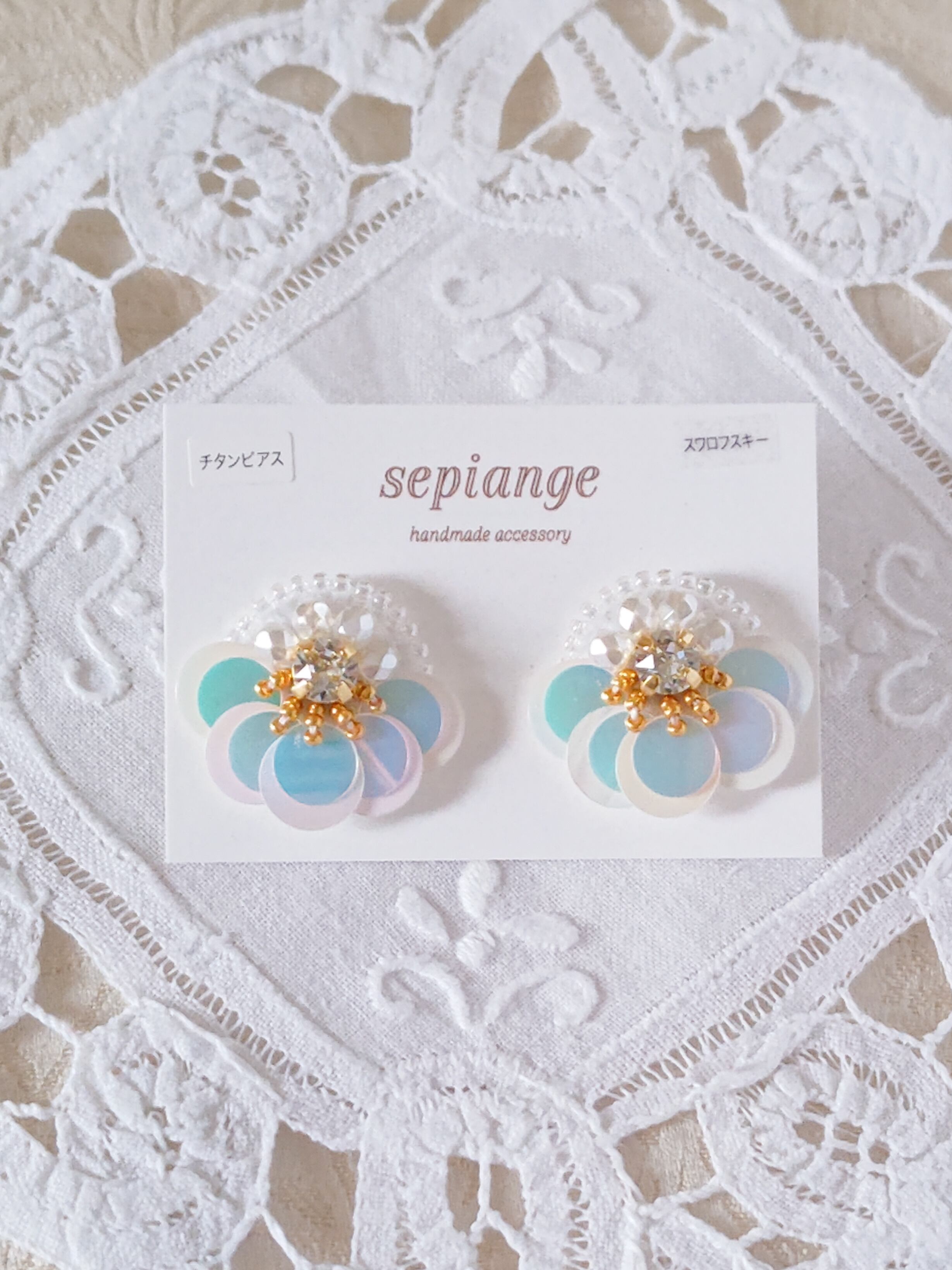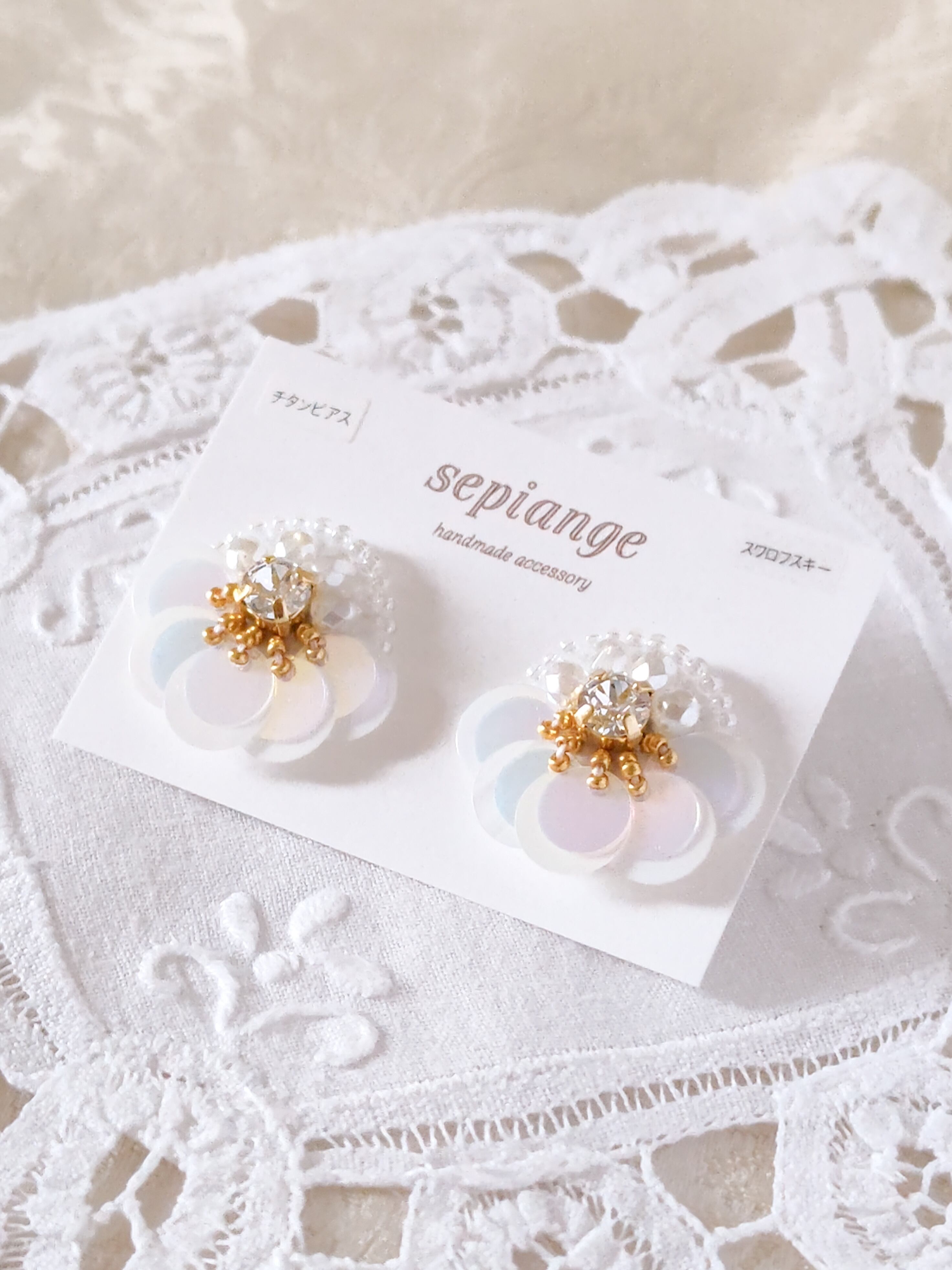 ビーズ刺しゅうの技法でスワロフスキーやスパンコール、ビーズを1つひとつ縫いつけて製作しました。 お洋服に合わせて、おしゃれを楽しむ1つのアイテムとしてコーディネイトして楽しんでください♪ ──────────────────── 中心はスワロフスキークリスタル(クリスタル)です。 スパンコールを重ねて、羽のように広がるデザインとなっております。 お色は白。 お呼ばれなどの特別な日にも上品にお使いいただけます。 縁周りはビーズで丁寧にステッチしています。 ──────────────────── 裏側は白のフェイクレザーを使用し金具があまり見えないような工夫をしております。 そして、耳に触れる部分にフェイクレザーを使うことで肌触りもよく 痛くなりにくいとご好評いただいております。 ピアスはキャッチ部分、イヤリングは耳に当たる部分にシリコンゴムを付けております。 ──────────────────── サイズ:縦2cmx横1.8cm 金具:ネジバネイヤリング、チタンピアス 金具の色:ゴールド 素材:スワロフスキー、スパンコール、ビーズ、金具(真鍮、チタン) ──────────────────── 色展開 ◎白×ゴールド https://sepiange.base.shop/items/52799104 ◎ゴールド https://sepiange.base.shop/items/56841824 ──────────────────── アクセサリーはすべて小箱にお入れしての発送となります。 ご不明な点、ご質問はご注文の前にお願い致します。 ※ご注文の前にプロフィールをご一読ください。 フォーマル お呼ばれ 入学式 お出かけ 女子会 上品 シンプル フェミニン かわいい おしゃれ 綺麗 小ぶり ギフト プレゼント 誕生日 二次会 ドレス パール ビーズ カボション ボタン くすみカラー アンティーク クラシカル アクセサリー ジュエリー 花 貴婦人 スワロフスキー リボン スパンコール スパングル オーロラ ニュアンスカラー セレモニー