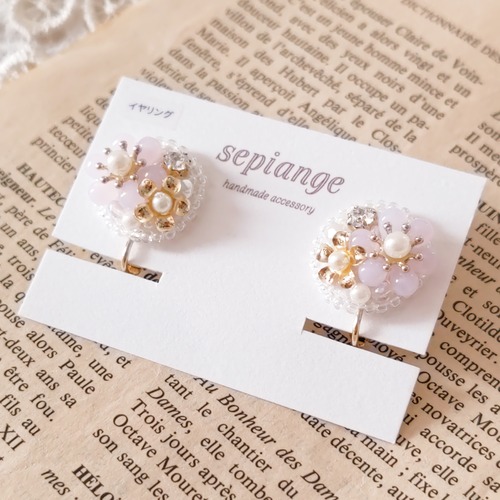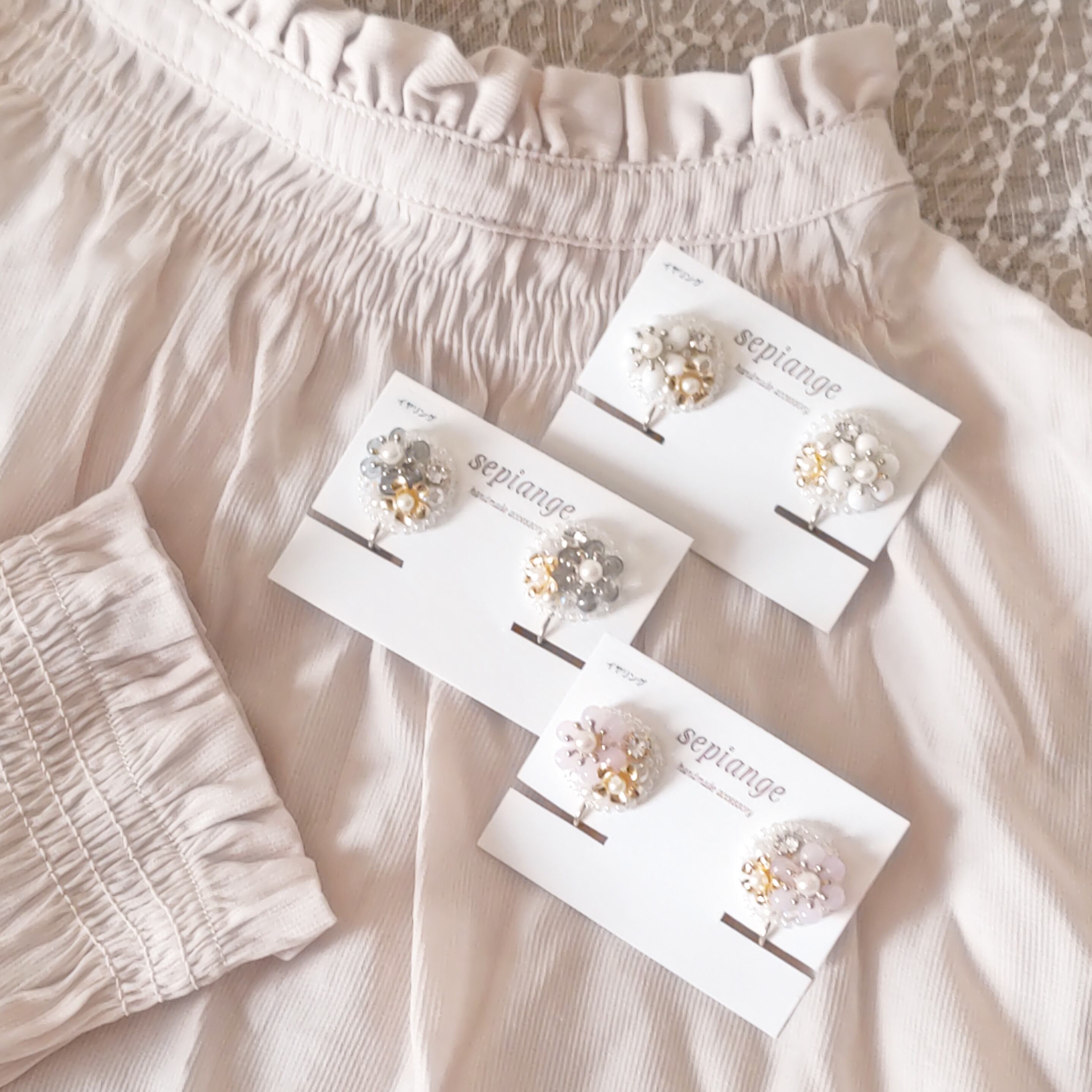 ✼••┈┈┈┈••✼••┈┈┈┈••✼ 2/25(金)21:00~3/2(水)23:59の期間 受注生産いたします♡ 受注生産のため状況によりお届けまでに1週間~10日 いただく場合がありますことをご了承ください。 ✼••┈┈┈┈••✼••┈┈┈┈••✼ 『春』といえば何を思い浮かべますか? sepiangeからは、卒業式や入学式などの セレモニーシーズンにお使いいただける 耳飾りをお届けします♡ ビーズ刺繍の技法で 小さなお花やパール、スワロフスキー(クリスタル)やビーズを 1つひとつ縫いつけて製作しました。 ──────────────────── 春は少しずつ暖かくなり綺麗なお花が咲いて 気分も明るくなりますよね(öᴗ<๑) そんな気分も取り入れたいと 可愛い小花もビーズで製作しています。 ──────────────────── こちらのお色はミルキーピンク。 少し可愛く華やかな印象になります。 ──────────────────── 縁周りはビーズで丁寧にステッチしています。 『どこから見ても綺麗』にこだわってお作りしています。 ──────────────────── 裏側は白のフェイクレザーを使用し 金具があまり見えないような工夫をしております。 そして、耳に触れる部分にフェイクレザーを使うことで肌触りもよく 痛くなりにくいとご好評いただいております。 イヤリング金具にはシリコンカバーもお付けしています。 ──────────────────── サイズ:縦1.8cmx横1.8cm 金具:蝶バネイヤリング、チタンピアス 金具の色:ゴールド 素材:ビーズ、パール、スワロフスキー(クリスタル)、メタルパーツ、金具(真鍮、チタン) ※ピアス(真鍮・チタン)・イヤリングはオプションからお選びください。 ──────────────────── 色展開:3色 ○白 https://sepiange.base.shop/items/58044335 ○ミルキーピンク https://sepiange.base.shop/items/58540245 ○グレー https://sepiange.base.shop/items/58540325 ──────────────────── また今回から 2wayパーツをオプションでお選びいただけます。 (各1650円) 詳細はこちら↓からご覧ください。 ①パールチェーン https://sepiange.base.shop/items/58427459 ②コットンパール(しずく型) https://sepiange.base.shop/items/58545609 ③コットンパール(煌めき) https://sepiange.base.shop/items/58545902 別売りもしておりますので 2wayパーツだけのご購入もしていただけます。 それぞれの販売ページをご覧ください。 〇イヤリング金具に付けるの場合 ネジバネタイプのものにはネジバネ式、蝶バネ式 どちらもお使いいただけるようなパーツとなっております。 〇ピアス金具に付ける場合 基本的にはビーズ刺繍本体とキャッチの間に挟むタイプですが キャッチに付けるというタイプも可能です。 お選びいただき、コメントに一言書いていただけますと幸いです。 ──────────────────── ご不明な点、ご質問はご注文の前にお願い致します。