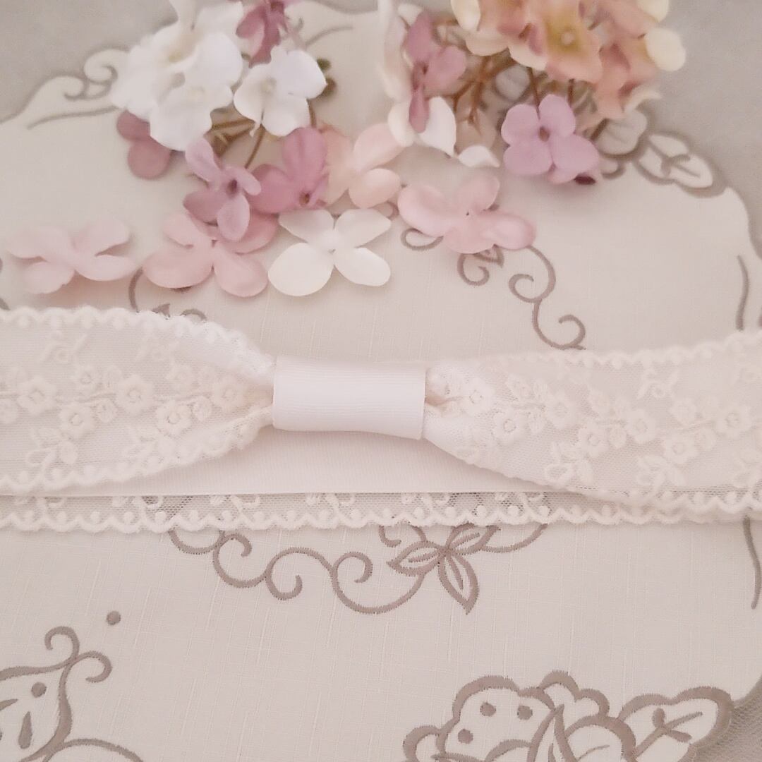 クリーム色のグログランリボンとレースでリボンの形にしております。