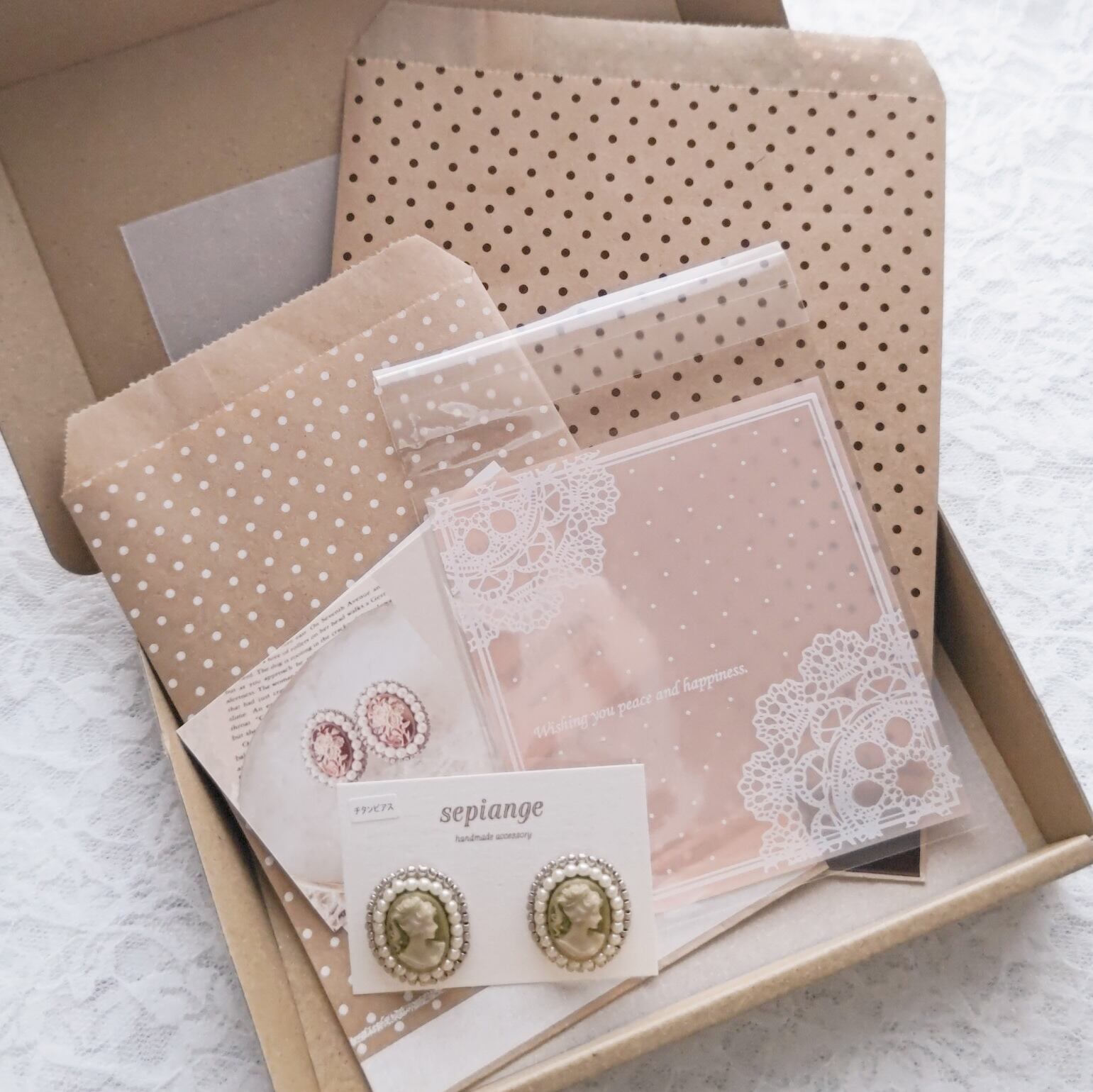 sepiangeの商品では《ギフトラッピング》をお選びいただけます。 《ギフトラッピング》 商品をOPP袋に入れ、オーガンジーの巾着に入れます。 作品によっては小箱にお入れします。 ※基本的にはsepiangeおまかせとなります。 箱の段ボールに薄紙や保護材を入れた上に商品をお入れします。 そのままプレゼントにもしていただけるよう、お渡し用の持ち手付ビニール袋をお付けします。 ※巾着やビニール袋などその時によってデザインが変わることもございます。 ご希望いただけましたら、封をする前の状態を写真でご確認いただくことも可能です。 ラッピング材料費などとして、+300円頂戴いたします。 https://www.instagram.com/reel/CiSQmsiDEyS/?igshid=YmMyMTA2M2Y= ーーーーーーーーーーーーーーーーーーーーーーーーーーーーーー ⚫通常梱包:商品をOPP袋に入れ、保護材入りの箱の段ボールに入れ、透明のOPP袋に入れてお送りします。 ⚫簡易ラッピング(無料): ①商品をOPP袋に入れたあと紙袋に入れ、箱の段ボールに入れ、透明のOPP袋に入れてお送りします。 https://www.instagram.com/reel/CYGsK82BmdC/?igshid=YmMyMTA2M2Y= ②OPP袋に入れ、口をリボンで結んで保護材を入れた段ボールに入れます。最後は透明のOPP袋に入れてお送りします。 https://www.instagram.com/reel/CaRvwsBDfEi/?igshid=YmMyMTA2M2Y= どちらかになります。ご希望があれば承ります。 ーーーーーーーーーーーーーーーーーーーーーーーーーーーーーー それぞれの商品ページからもオプションでお選びいただけます。 商品ご購入後、ご自身でラッピングしたい場合ラッピング材料のみご購入も可能です。 質問、メッセージなどでお問い合わせください。 複数商品をお買い上げで、一つのみギフトラッピング希望なども対応させていただきますので、お気軽にお問い合わせください。