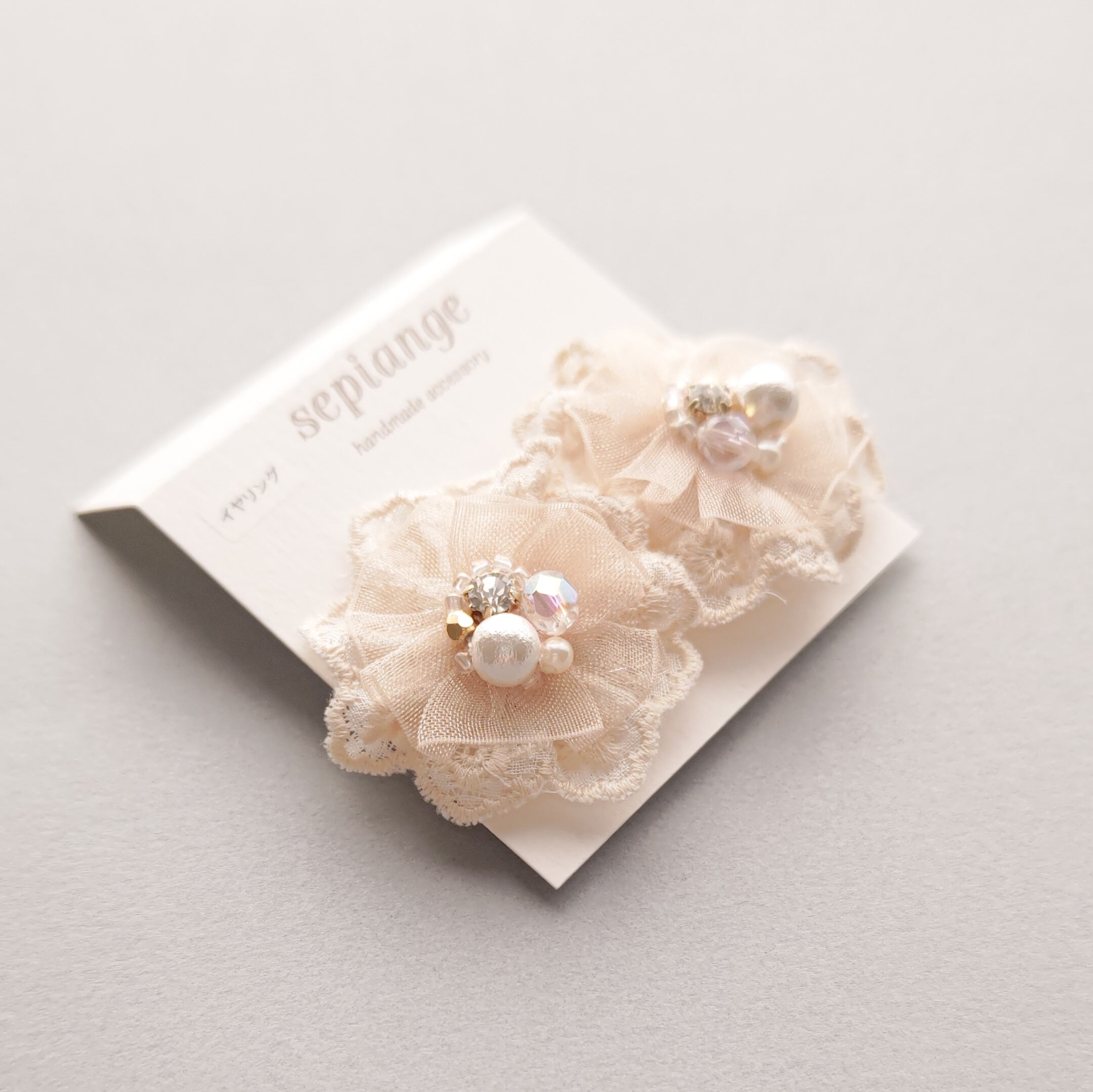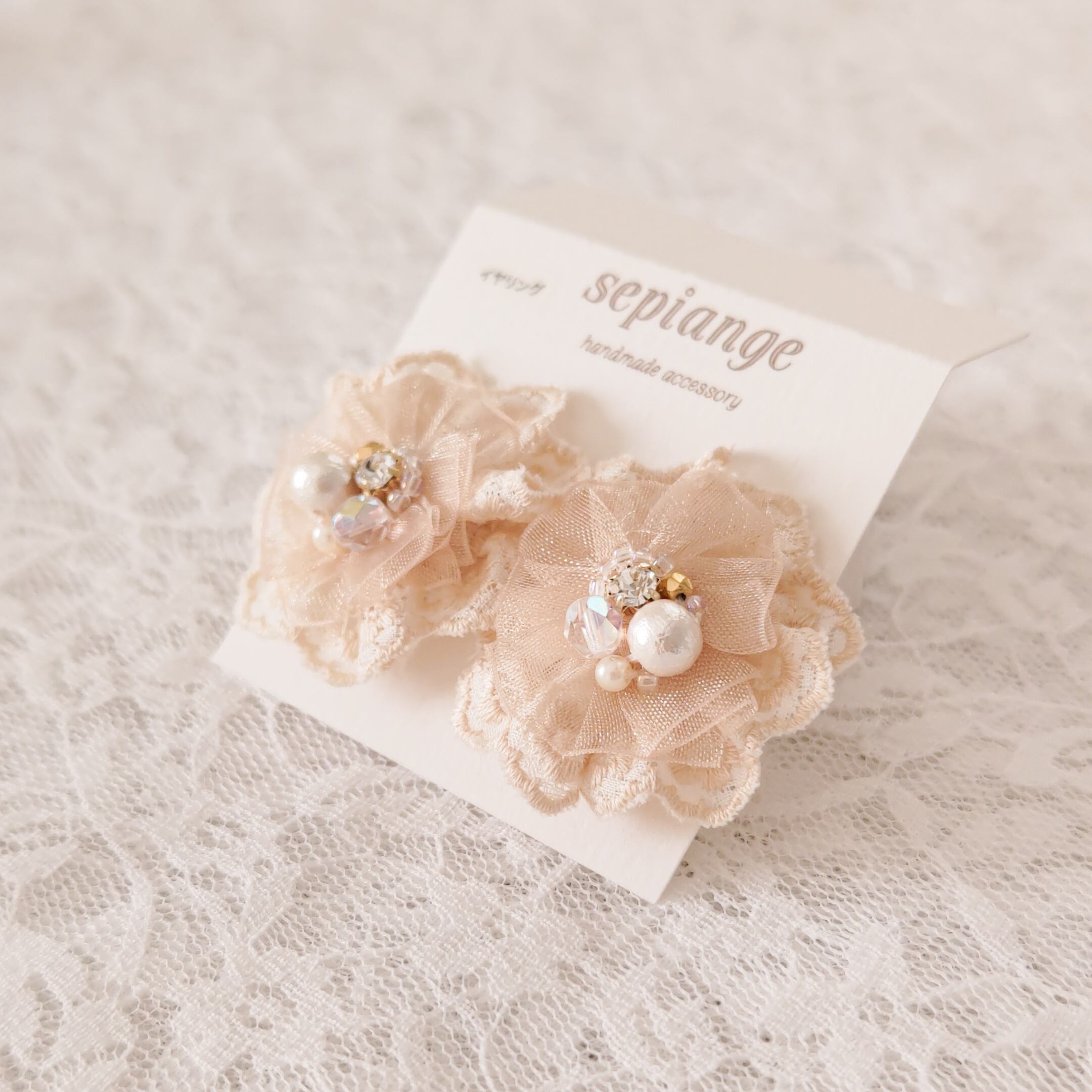 ビーズ刺しゅうの技法でレースのお花を作り、中心にパールやビジュー、リボンなどを1つひとつ縫いつけて製作しました。 白や薄めのお色のお洋服だとイヤリングが映えると思いますよ♡ これ一つで大人可愛くなります♪ お出かけの時におしゃれを楽しむアイテムとしてコーディネイトして楽しんでください。 ──────────────────── 全体的にベージュ系のお色味で落ち着いています。 ─────────────────── 裏側は白のフェイクレザーを使用し金具があまり見えないような工夫をしております。 そして、耳に触れる部分にフェイクレザーを使うことで肌触りもよく 痛くなりにくいとご好評いただいております。 イヤリングはシリコンゴム付きです。 ──────────────────── サイズ:直径約3.7cm 金具:蝶バネイヤリング 金具の色:ゴールド 素材:レース、ビーズ、パール、ビジュー、オーガンジーリボン、金具(真鍮) ──────────────────── ご不明な点、ご質問はご注文の前にお願い致します。