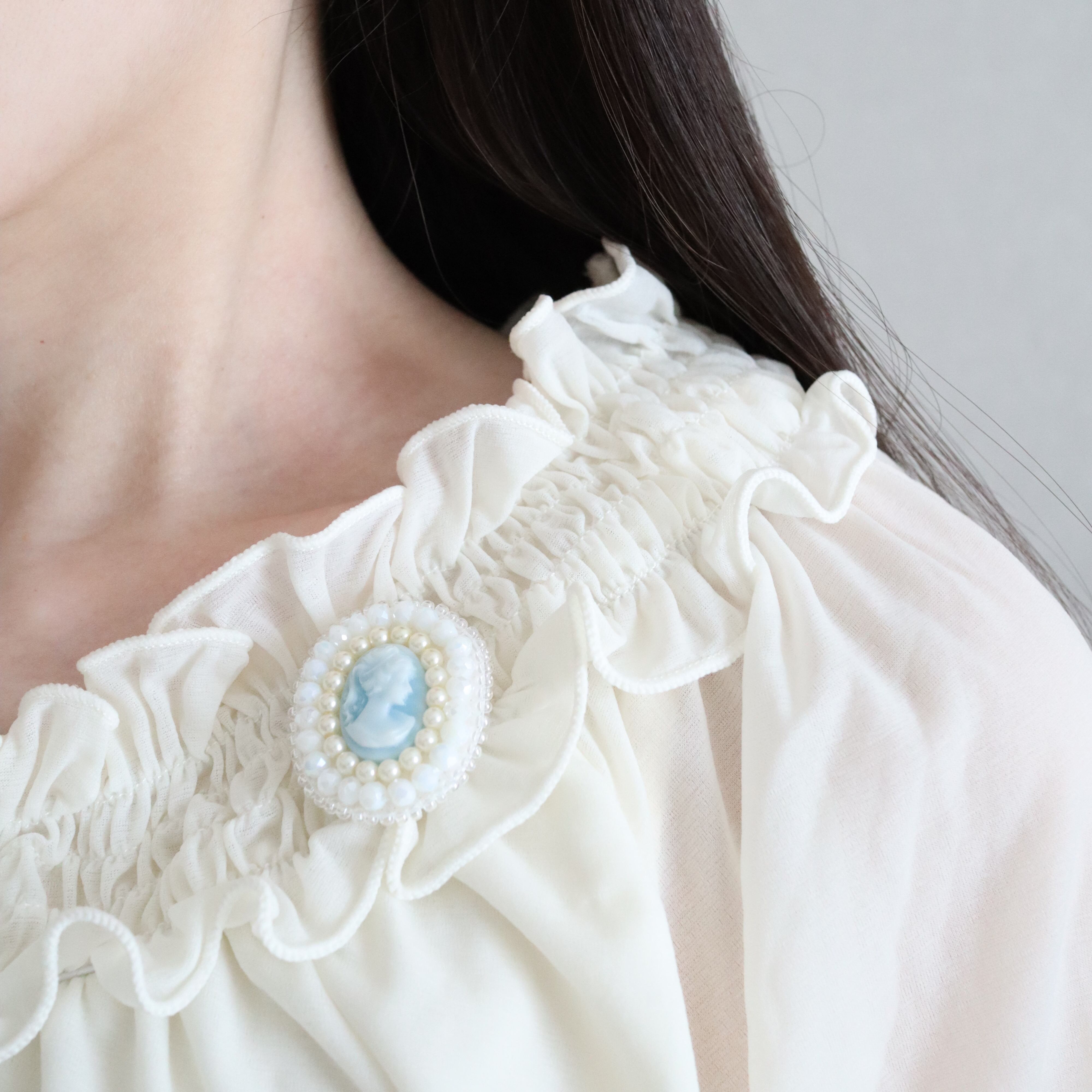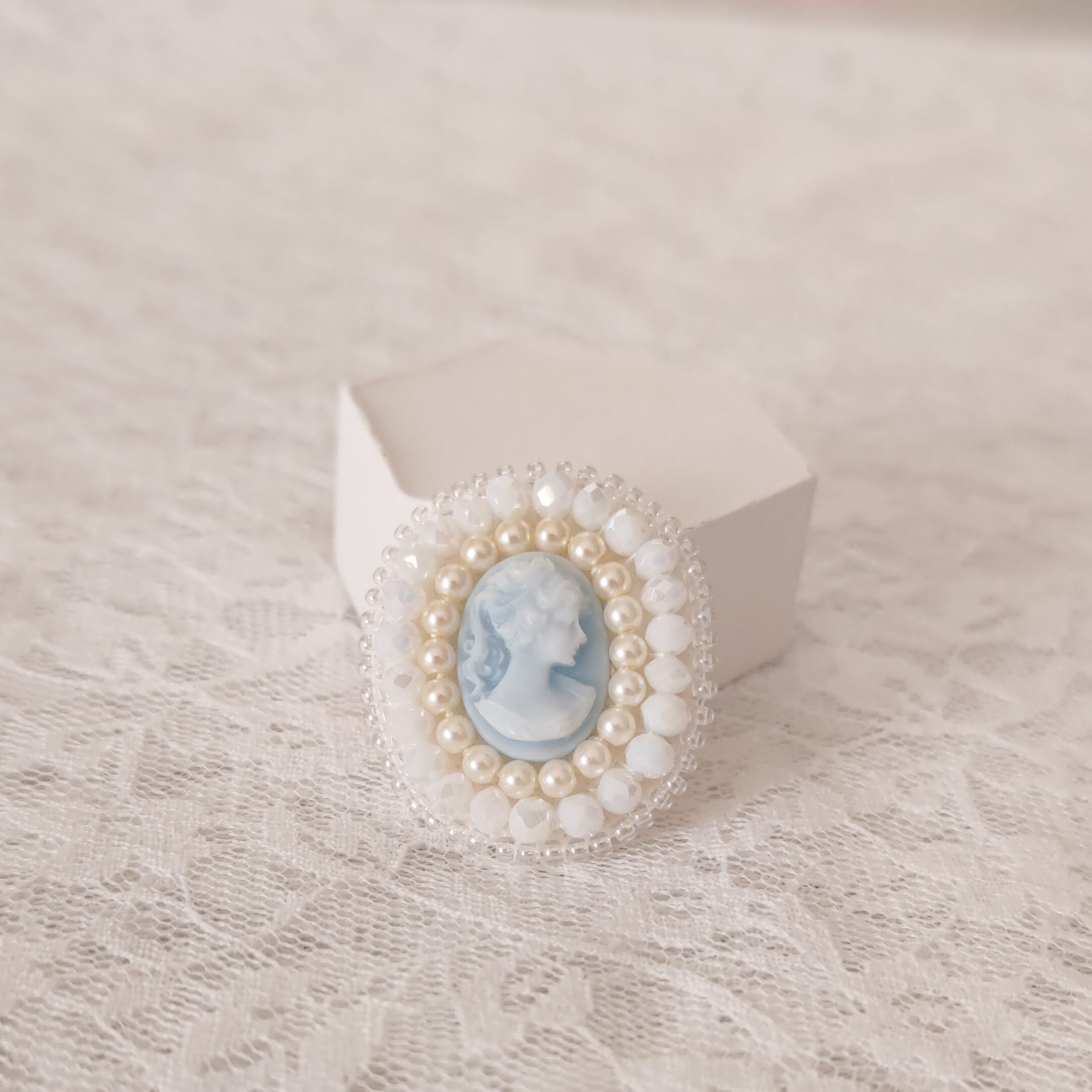 ビーズ刺しゅうの技法でパールやビーズを1つひとつ縫いつけて製作しました。