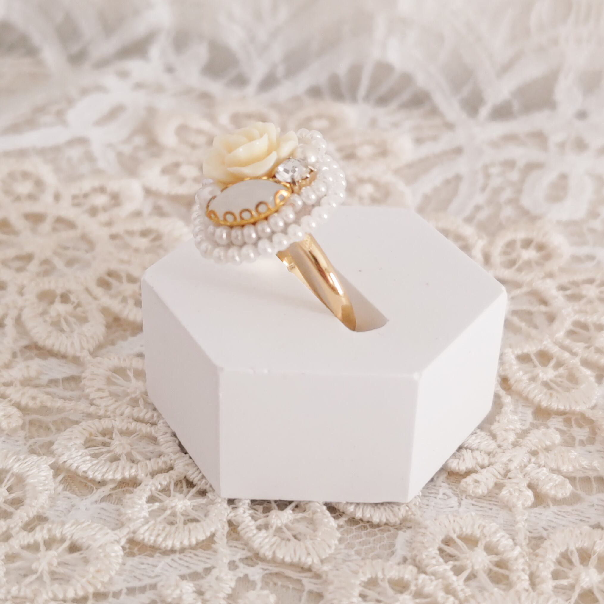 ビーズ刺しゅうの技法でクリームイエローの薔薇をメインに、パールやビーズ、ビジューを1つひとつ縫いつけて製作しました。