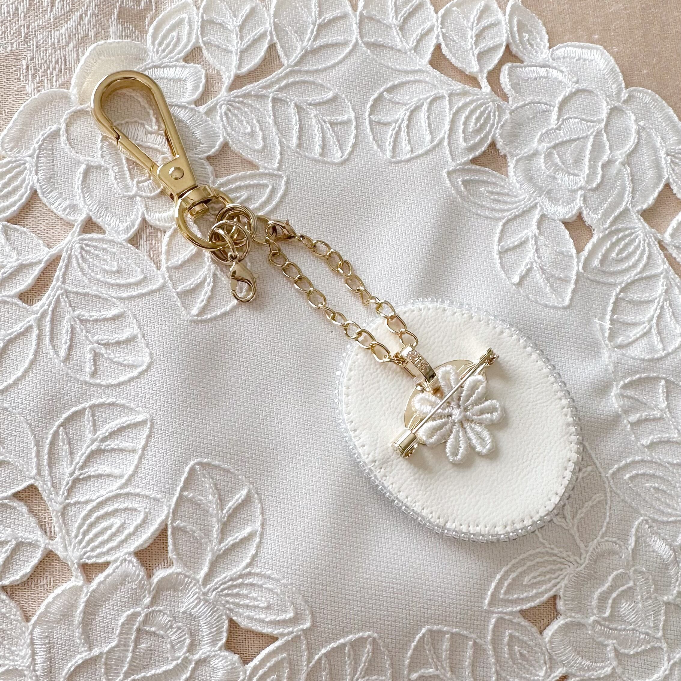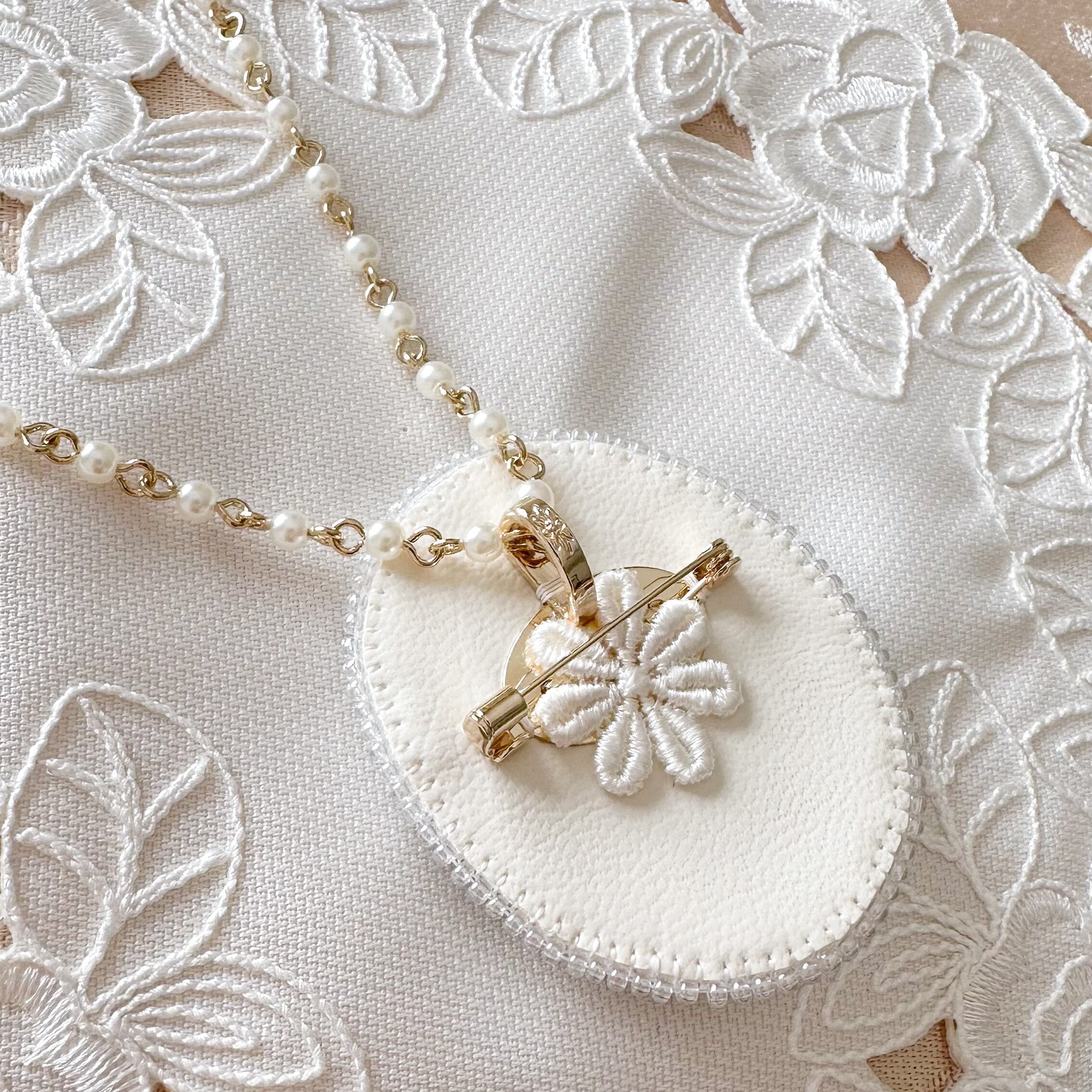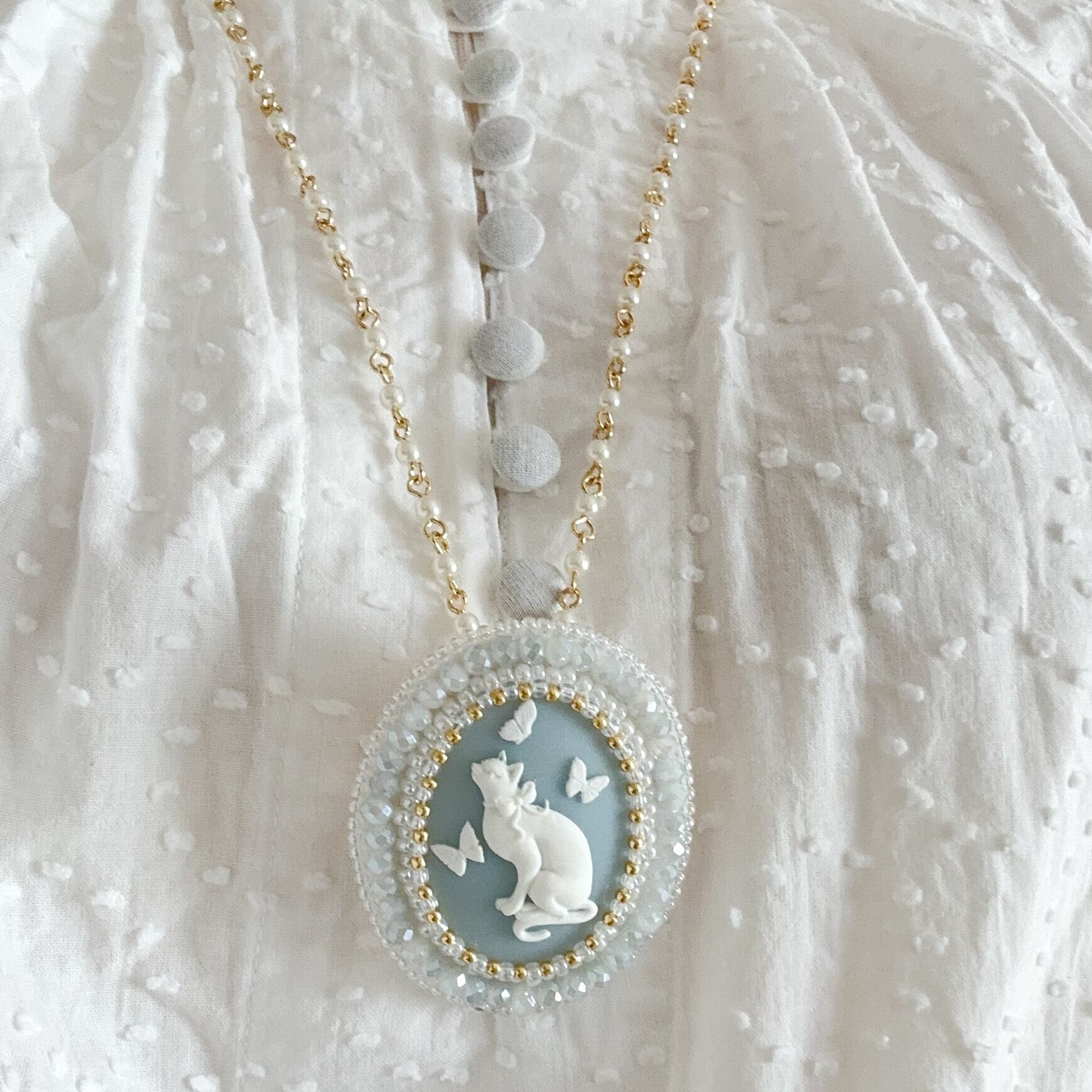 お座りしている猫ちゃんが首にリボンを結んで 周りには蝶が飛んでいるデザインのカメオです。 周りはカメオのお色に合わせてビーズ刺繍しております。 金具は2wayブローチ。 少し大きめなのでブローチとしてだけではなく ネックレスやバッグチャームとしてもお使いいただけるよう、カン付きのものにしております。 サイズ:縦6cm×横4.7cm ──────────────────── 裏側はフェイクレザーを使用しております。