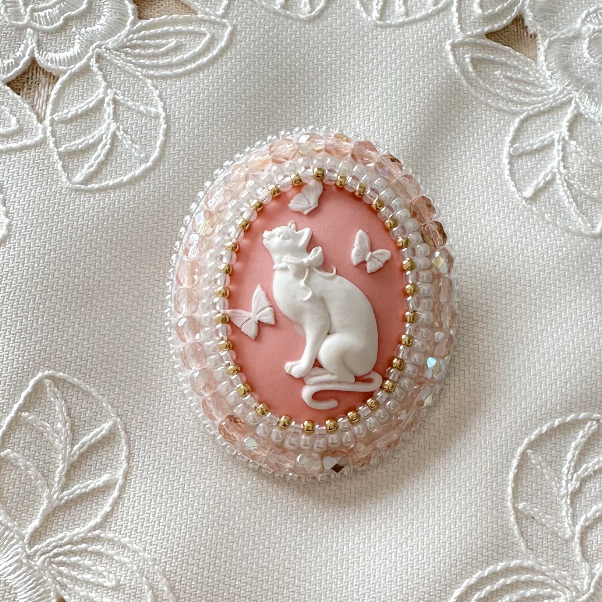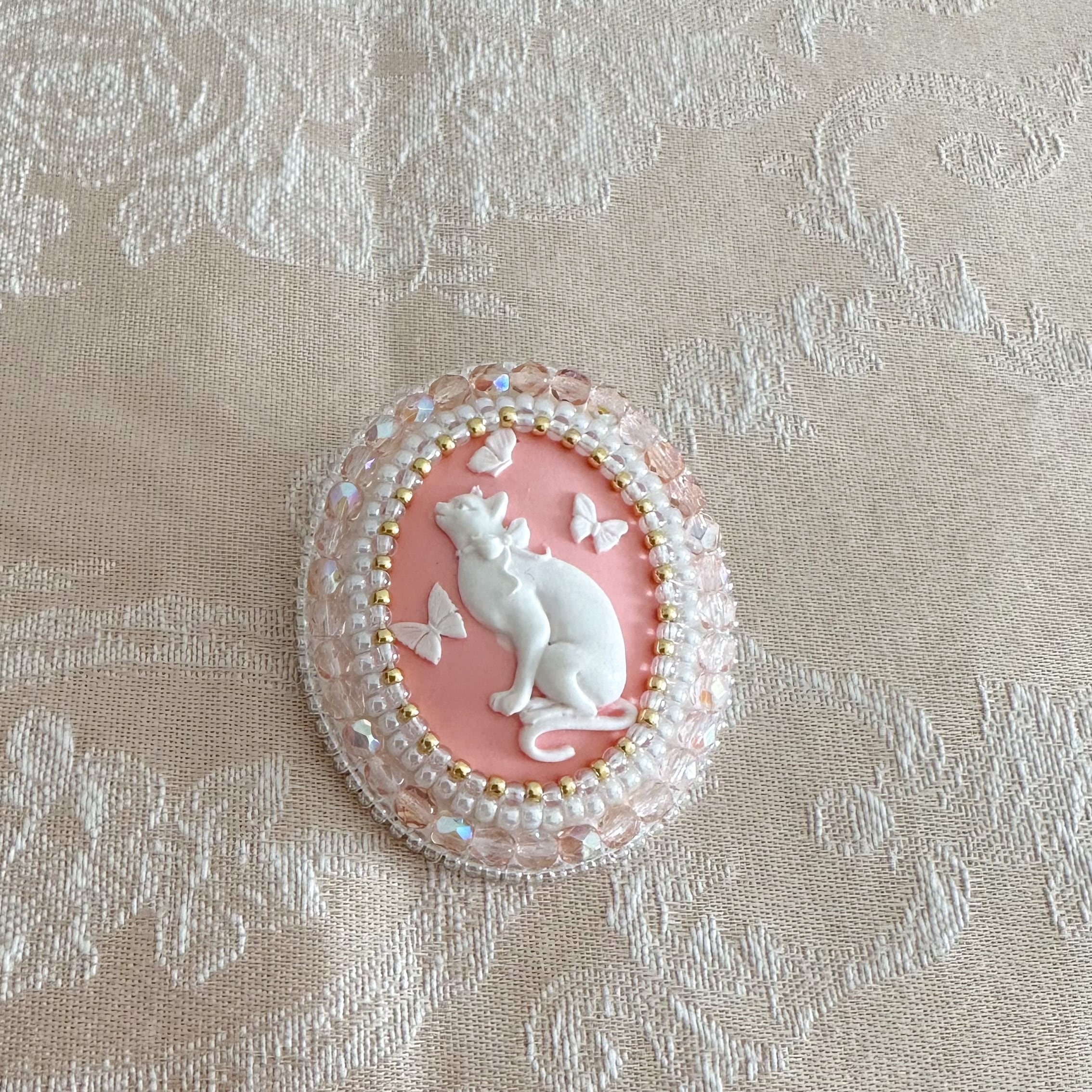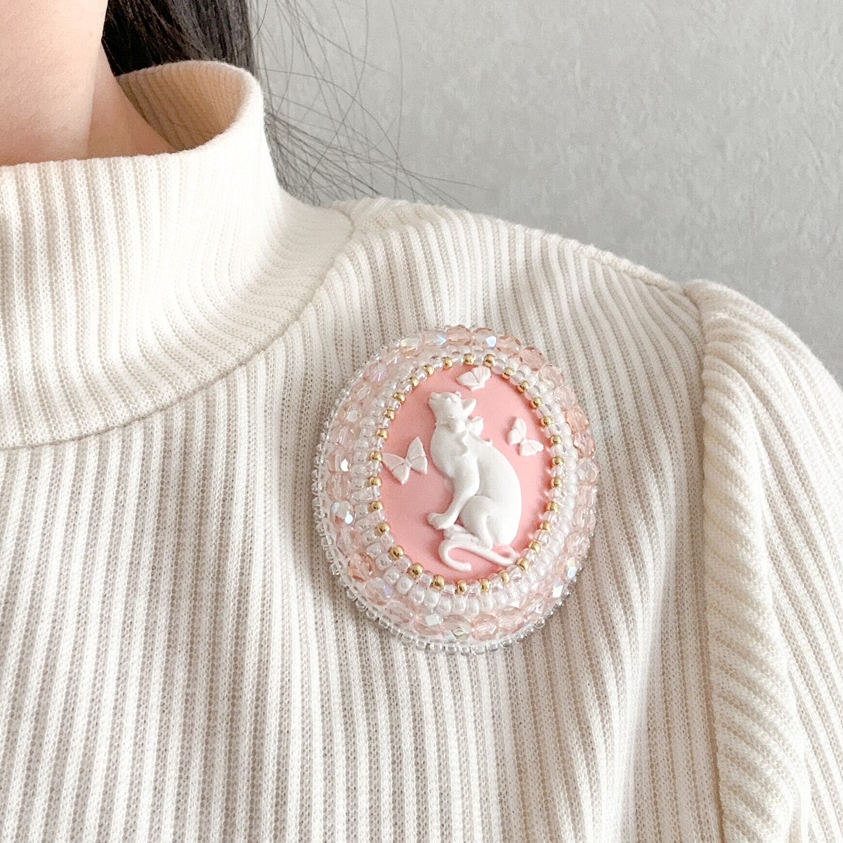 お座りしている猫ちゃんが首にリボンを結んで 周りには蝶が飛んでいるデザインのカメオです。 周りはカメオのお色に合わせてビーズ刺繍しております。 金具は2wayブローチ。 少し大きめなのでブローチとしてだけではなく ネックレスやバッグチャームとしてもお使いいただけるよう、カン付きのものにしております。 サイズ:縦6cm×横4.7cm ──────────────────── 裏側はフェイクレザーを使用しております。