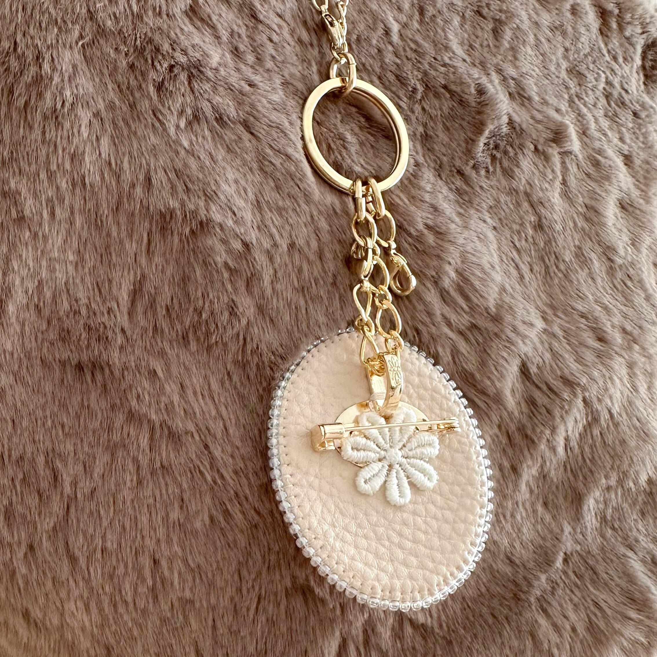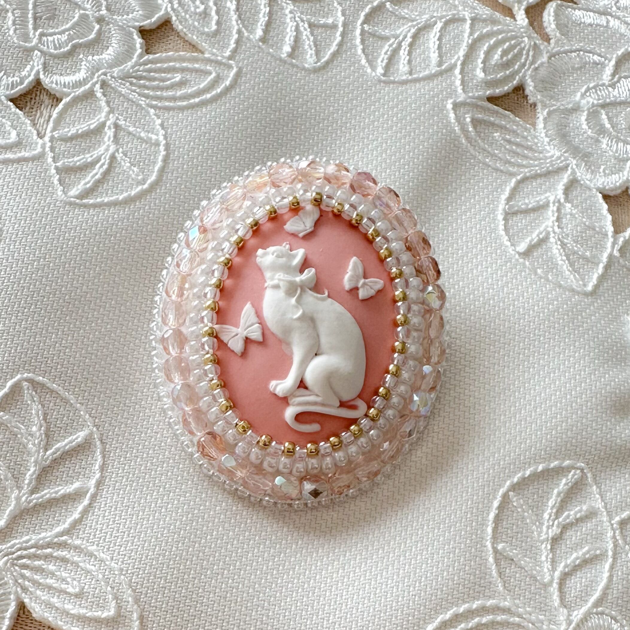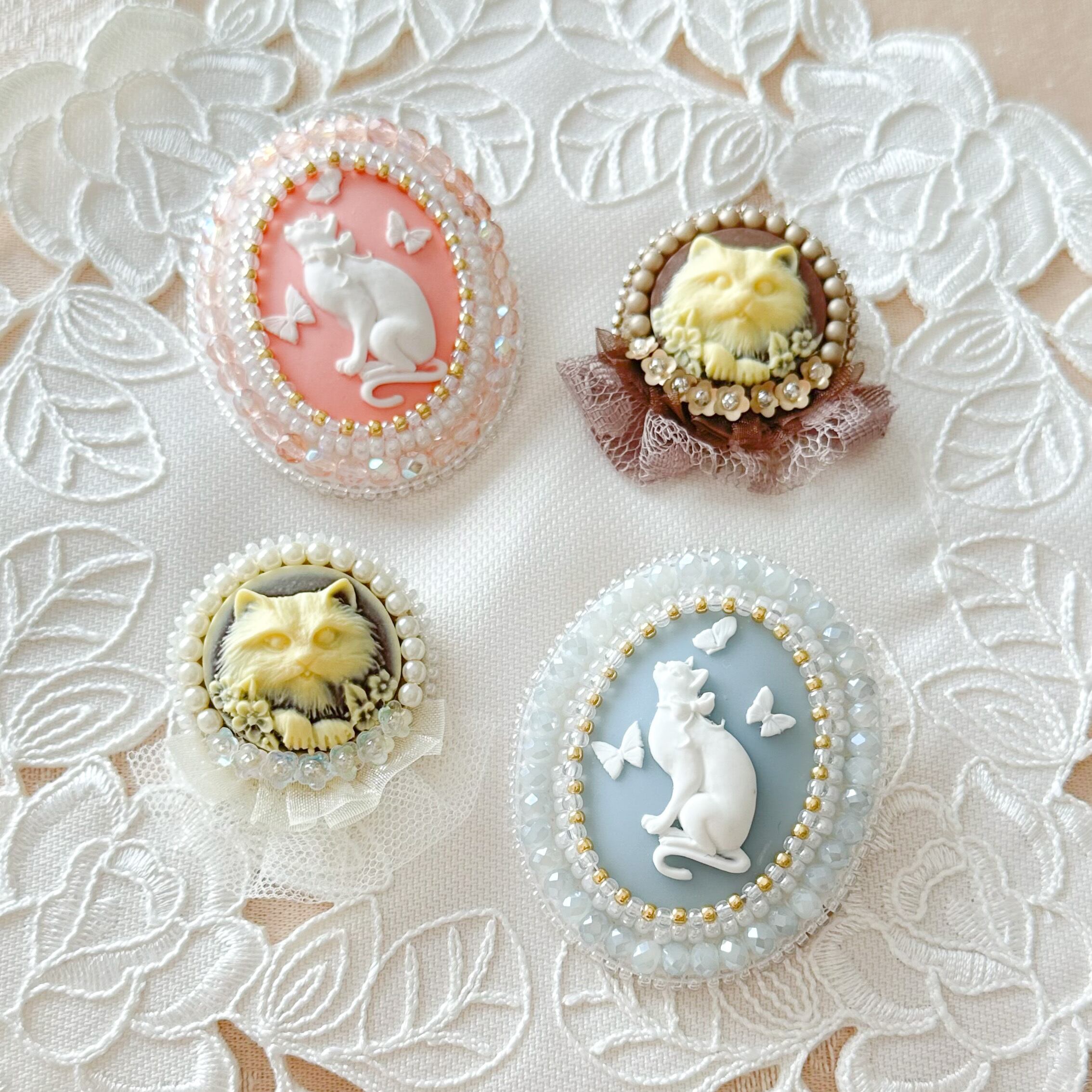 お座りしている猫ちゃんが首にリボンを結んで 周りには蝶が飛んでいるデザインのカメオです。 周りはカメオのお色に合わせてビーズ刺繍しております。 金具は2wayブローチ。 少し大きめなのでブローチとしてだけではなく ネックレスやバッグチャームとしてもお使いいただけるよう、カン付きのものにしております。 サイズ:縦6cm×横4.7cm ──────────────────── 裏側はフェイクレザーを使用しております。